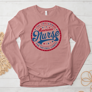 Meet your new favorite Long Sleeve Tee – the perfect blend of comfort and style! This American Nurse Long-Sleeve! design is custom printed on our premium BELLA + CANVAS 3501 Jersey Long Sleeve Tee.