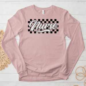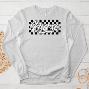 Meet your new favorite Long Sleeve Tee – the perfect blend of comfort and style! This Checkered Nurse Long-Sleeve! Design is custom printed on our premium BELLA + CANVAS 3501 Jersey Long Sleeve Tee.