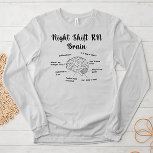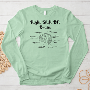 Meet your new favorite Long Sleeve Tee – the perfect blend of comfort and style! This Night Shift Brain Long-Sleeve! Design is custom printed on our premium BELLA + CANVAS 3501 Jersey Long Sleeve Tee.