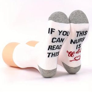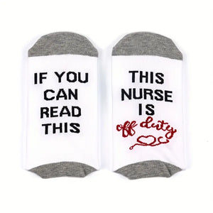 This pair of one-size-fits-all socks are knit with the saying, "If you can read this, this nurse is off duty."