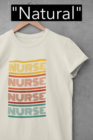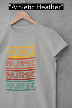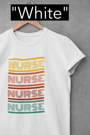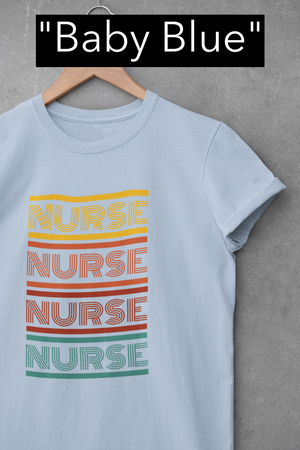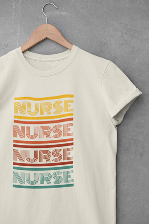 Emblazoned on the front of the shirt is the word "Nurse," rendered in a vibrant, retro-style font that harks back to classic design while maintaining a modern edge. The high-quality print ensures durability, guaranteeing that your shirt will continue to make a statement for a long time to come.