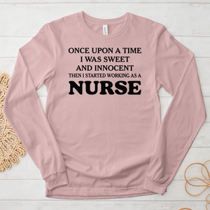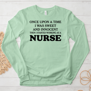 Meet your new favorite Long Sleeve Tee – the perfect blend of comfort and style! This Sweet Innocent Nurse Long-Sleeve! design is custom printed on our premium BELLA + CANVAS 3501 Jersey Long Sleeve Tee.